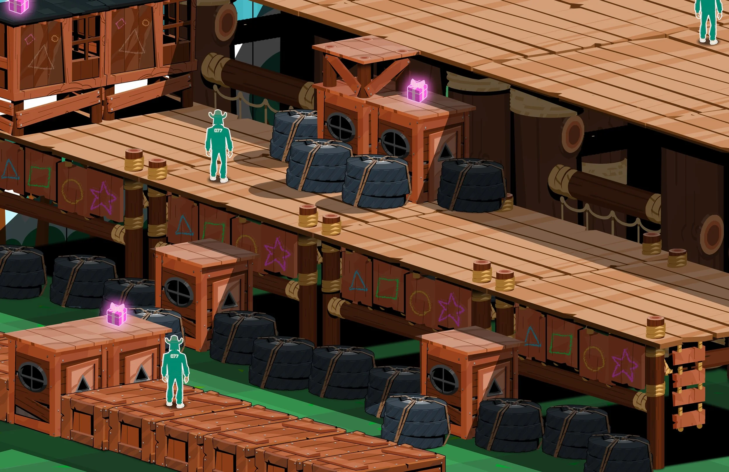 The earliest days of SquidGame Unleashed were spent debating and iterating on the style that we’d use to define our asset buildout by. We started off with something plainly geometric and marched our way towards an ambitiously detailed mobile style. Every build failed when launched, but we successfully benchmarked the actual parameters we could hope for in a 32 player arena and landed on the following test environments using baked light maps and cel-shading in the dynamic game objects:
